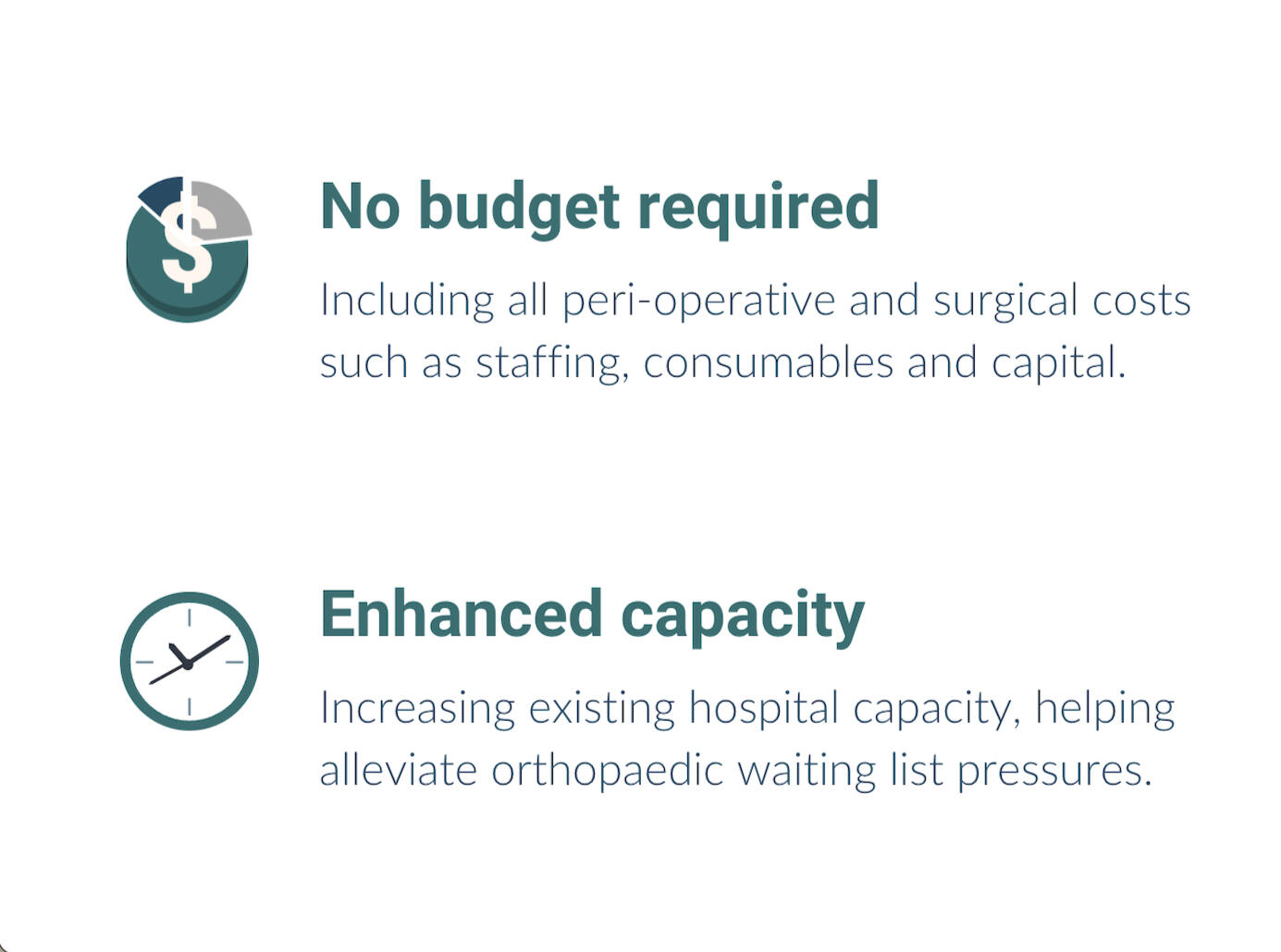 We provide you with fully staffed teams of orthopaedic surgical, nursing, and rehabilitation experts to efficiently reduce your orthopaedic surgical waiting lists and enhance patient peri-operative care.